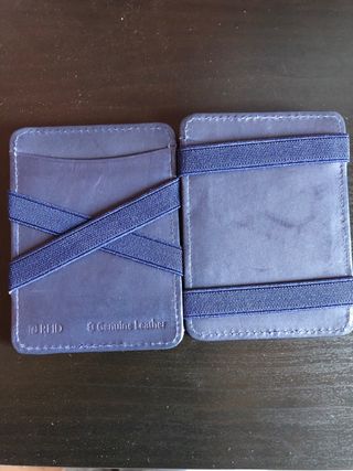Portafoglio compatto in pelle blu. - Design con più fessure per carte. - Logo Hunterson impresso sul davanti.