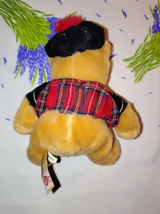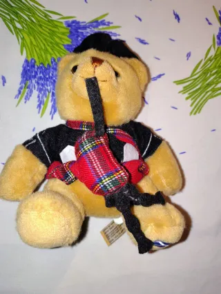 Simpatico peluche a forma di orsetto vestito da scozzese con kilt e bagpipes. - Orsetto di peluche. - Vestito tradizionale scozzese. - Include bagpipes. - Dettagli a quadri rossi e neri.