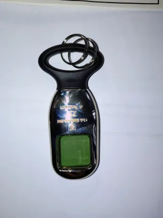 Portachiavi con un design moderno e un piccolo display integrato. La parte superiore è in plastica nera con anelli portachiavi in metallo, mentre la parte inferiore è in metallo lucido. - Display integrato. - Anelli portachiavi in metallo.