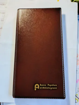 Rubrica telefonica in similpelle marrone. Vintage Anni 70 - Copertina rigida con finitura lucida. - Logo dorato Banca Popolare di Abbiategrasso sul fronte. - Bordi rifiniti con cucitura a vista.