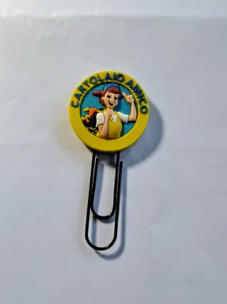 Clip fermacarte con personaggio Cartolaio Amico. - Personaggio tridimensionale. - Bordo giallo. - Sfondo blu. Vintage
