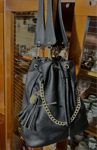 Elegante borsa a secchiello LiuJo, perfetta per aggiungere un tocco di stile. - Materiale effetto pelle martellata. - Chiusura con coulisse. - Dettagli metallici color oro. - Charm pendente con nappina. - Presenta leggere screpolature sui manici e sui bordi