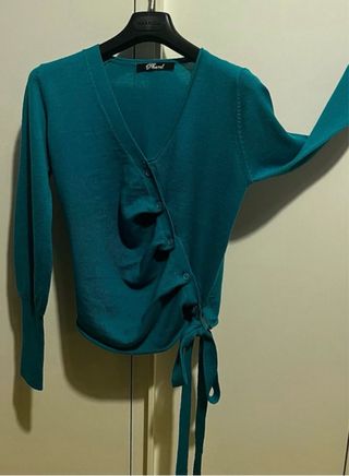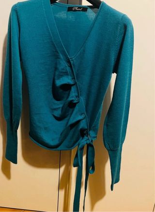 Cardigan maglioncino Phard con chiusura a bottoni e laccetto laterale. Mai indossato Modello particolare I bottoncini si possono slacciare 50%lana 50%acrilico La parte destra del maglioncino presenta dei microforellini regolari,che fanno parte della lavorazione NON È UN DIFETTO per le misure,vedere foto