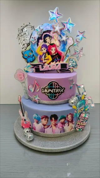 Torta scenografica a tema Huntrix, perfetta per feste e celebrazioni. - Decorazioni a tema musicale con note, stelle e strumenti. - Personaggi stilizzati e logo Huntrix. - Struttura a due piani con colori vivaci.
