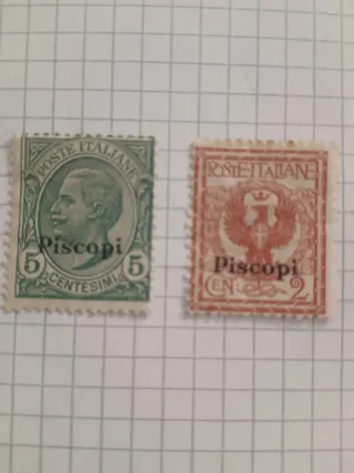 Due francobolli del Regno d'Italia, specifici per le Isole Egee,Piscopi - Francobollo verde con ritratto e valore 5 centesimi. - Francobollo rosso con stemma e valore 2 centesimi.