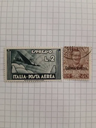 Due francobolli d'epoca. - Francobollo Espresso L.2 Italia-Posta Aerea. - Francobollo Colonia Eritrea Poste Italiane EN 40.