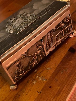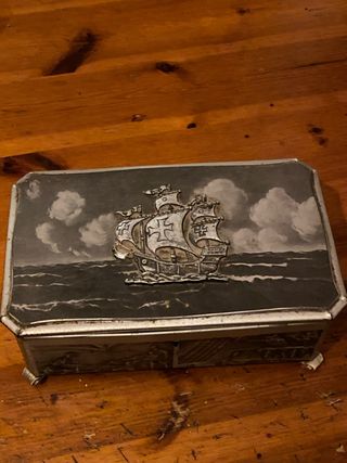 Scopri il fascino senza tempo di questa scatola decorativa in metallo, perfetta per aggiungere un tocco elegante alla tua casa o come regalo speciale. Il coperchio è arricchito da una splendida placca in rilievo che raffigura un veliero su mare mosso, simbolo di avventura e stile vintage. Caratteristiche: • Materiale: Metallo lavorato, robusto e di alta qualità. • Design unico: Il veliero in rilievo e i dettagli sui lati rendono questa scatola un pezzo davvero speciale. • Funzione versatile: Ideale come portaoggetti, portagioie, o portasigarette, aggiungendo eleganza a qualsiasi ambiente. Condizioni: da pulire!