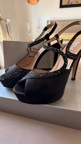 Eleganti sandali Tiffi realizzati in raso nero, impreziositi da strass scintillanti. - Materiale: Raso, tomaia in pelle, suola in cuoio - Dettagli: Strass decorativi - Design: Sandalo con plateau e tacco alto 12 cm. - completi di scatola, usati solo in occasione di un evento importante.