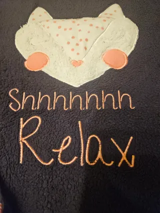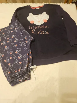 Comodo pigiama da donna composto da maglia e pantaloni. - Maglia blu con applicazione a forma di volpe e scritta Shhhhhhh Relax. - Pantaloni blu con fantasia di volpi. - Polsini e fondo maglia a costine.