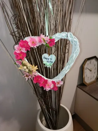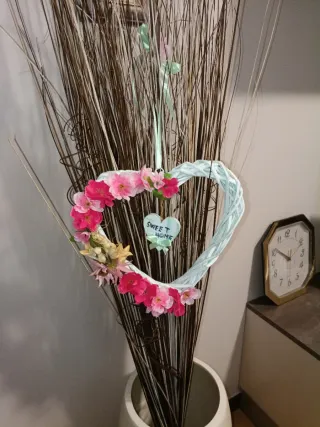 Bellissimo cuore decorativo, perfetto per dare un tocco primaverile alla tua casa. - Realizzato in materiale intrecciato di colore azzurro. - Decorato con fiori artificiali rosa e fucsia. - Piccolo cuore aggiuntivo con scritta Sweet Home.