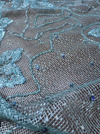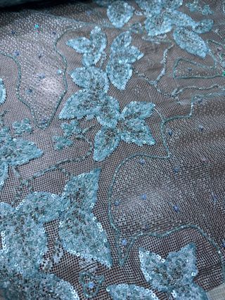 Bellissimo tessuto in tulle con ricami di coralli e paillettes. Altezza 1 m Metri disponibili 4 Peso 340/350 gr/mt - Colore: verde acqua - Dettagli: Paillettes e perline - Base: Tulle trasparente Il prezzo si riferisce al metro Se si acquistano tutti i metri €190