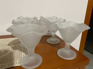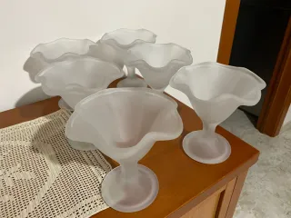 Bellissimo set composto da 6 calici/coppe a forma di fiore in vetro smerigliato. Eleganti e decorativi, ideali come coppe da dessert, gelato, macedonia oppure come oggetti decorativi. • Materiale: vetro smerigliato • Forma: fiore • Diametro: circa 13 cm • Quantità: 6 pezzi • Condizioni: come nuove, senza scheggiature o difetti Perfette per tavola elegante, dessert o arredamento vintage/shabby chic.