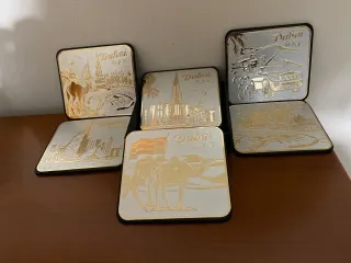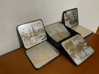 Set di 6 sottobicchieri a tema Dubai, perfetti come souvenir. Presentano un design argentato con incisioni dorate. - Raffigurano monumenti e scene tipiche di Dubai. - Nuovi, mai utilizzati.