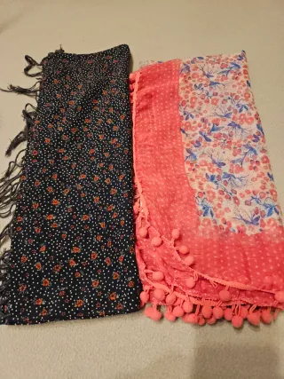 Conjunto de dos bufandas para niña con estampados alegres. - Una bufanda es azul marino con lunares blancos y pequeñas flores naranjas. - La otra bufanda es rosa con un estampado floral en tonos azules y rosas, y detalle de pompones. - Ambas bufandas tienen un diseño ligero y colorido. Segni d'uso cone da foto