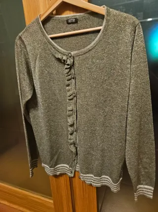 Elegante giacca cardigan con una trama a maglia che combina fili blu e oro. Presenta due tasche applicate sul fondo. - Design a maglia. - Dettagli in filo dorato. - Due tasche frontali. Ha dei tirati riportati in foto concentrati sotto la manica e poco vibili. Misure in foto