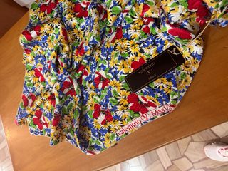 Bellissimo scampolo di pura seta Valentino Miss V con un vivace motivo floreale blu. Altezza 1,4 Metri 1,3 Bellissima seta lavorata - Tessuto 100% seta. - Fantasia di rose blu e bianche su fondo blu puntinato. - Logo Valentino Miss V visibile sul bordo.