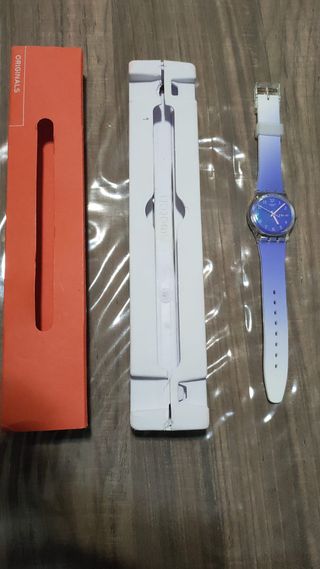 Orologio Swatch modello LK396 con cinturino sfumato dal blu al bianco. - Quadrante blu. - Cinturino in silicone sfumato. - Chiusura con fibbia. Vendo orologio della swatch perfettamente funzionante. Usato solo un paio di volte. Deve essere sostituita solo la piccola pila.