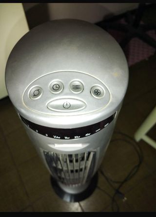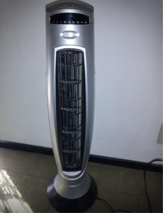 Ventilatore a torre dal design moderno, colore argento. - Altezza circa 75 cm. - Base stabile. - Griglia di protezione.