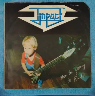 Impact – Never Too Young To Rock ©1982 Made in Belgium - BMR Records – BMR 001 Album from my private collection, both the vinyl and the cover in good conditionit's Cut-Out. Barcode: SABAM T.M.