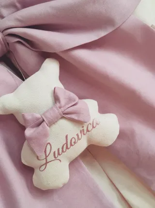 Fiocco nascita realizzato a mano, perfetto per accogliere un nuovo arrivo. - Decorato con un tenero orsetto. - Nome personalizzabile. - Realizzato in tessuto color rosa cipria e avorio.