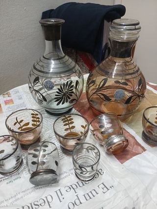 Set vintage bottiglie e bicchierini in vetro decorato con dettagli in argento 925 – anni ’60/’70 Vendo raffinato servizio vintage in vetro decorato, composto da 2 bottiglie con tappo e 7 bicchierini coordinati, arricchito da parti in argento 925. Un set elegante dallo stile retrò, ideale sia per l’uso che come oggetto da collezione o arredo. Composizione del set: 2 bottiglie panciute con tappo (una vetro fumé grigio, una vetro color ambra) 7 bicchierini coordinati Decorazioni floreali serigrafate Elementi in argento 925 Etichette originali presenti su alcune parti (visibili in foto) Caratteristiche: Vetro spesso e di qualità Motivi