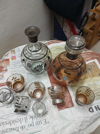 Set vintage bottiglie e bicchierini decorati