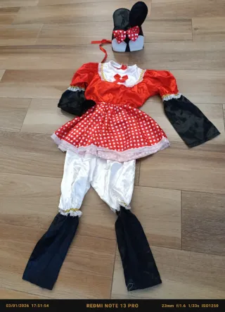 Bellissimo costume da topolina per bambina, perfetto per feste e carnevale. - Vestito rosso a pois bianchi con dettagli bianchi e rossi. - Maniche a sbuffo nere. - Pantaloncini bianchi. - Copristivali neri. - Fascia con orecchie da topolina e fiocco rosso.