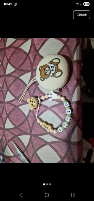 Set composto da catenella porta ciuccio e porta ciuccio coordinato, decorato con simpatici orsetti. - Catenella con perline colorate e lettere per personalizzare il nome. - Porta ciuccio rotondo con disegno di orsetto. - Clip per agganciare la catenella.