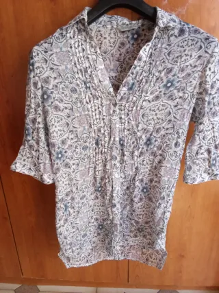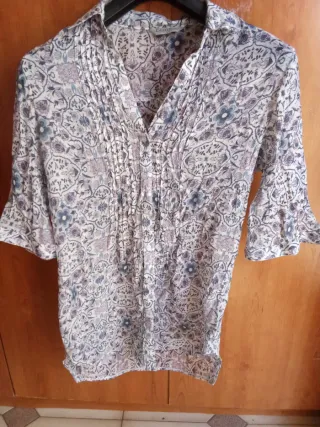 Camicia da donna con stampa floreale e maniche a tre quarti. Mai indossata. - Fantasia floreale multicolore su base bianca. - Scollo a V con dettagli plissettati. - Maniche a tre quarti.