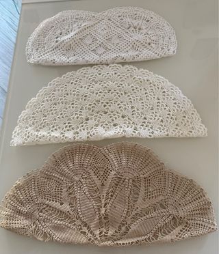 Set di tre centrini fatti a mano in vintage. Perfetti per aggiungere un tocco di eleganza a qualsiasi ambiente. - Realizzati a mano con cura. - Design floreale e geometrico. - Colori: bianco e beige. Appartenenti a vecchi corredi di circa 40 anni. Ovviamente ci tengo a precisare che potrebbero presentare qualche segno legato al passare del tempo ovvero piccole macchioline gialle facilmente eliminabili con il giusto lavaggio. Misura circa 50 cm Possibile vendita anche separati a pezzo singolo (30€ a centrino)