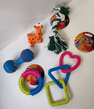 Il set comprende: - Un cagnolino in vinile con squeaker che quando viene schiacciato emette un suono: mis. c.ca 8 cm - Una corda: mis c.ca 20 cm - Un peluche con squeaker che quando viene schiacciato emette un suono: mis 18 cm c.ca - Un giochino in gomma con sonagli: mis. 13 cm c.ca - Una palla in gomma piena: mis. 5 cm c.ca