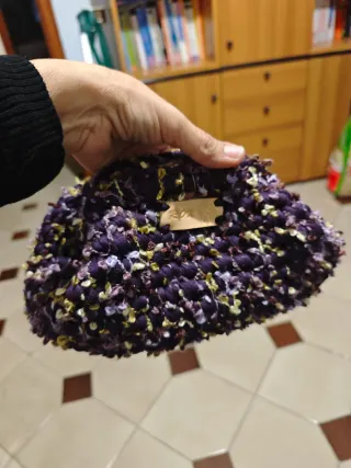 Borsetta realizzata all'uncinetto con un design unico. - Texture ricca e dettagliata. - Elementi bucle' e viola intrecciati.