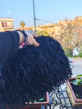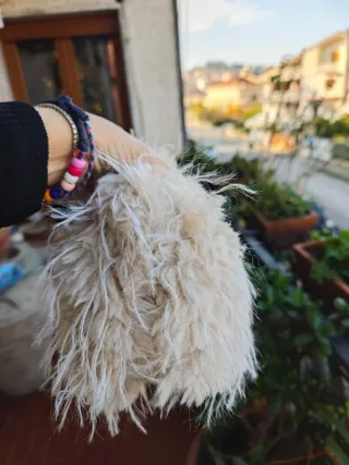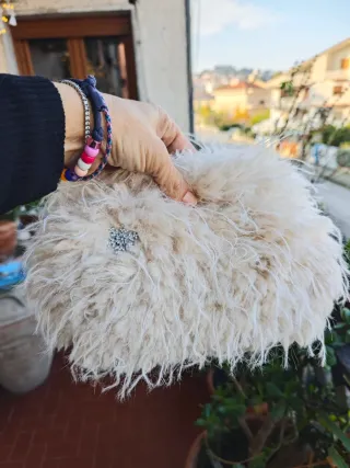 Borsa con un design unico e particolare, caratterizzata da una texture morbida e voluminosa.misura grande, - Materiale esterno con frange. - Forma arrotondata.