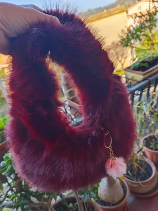 Elegante borsetta in materiale soffice e voluminoso, con un tocco di brillantezza. - Dettaglio decorativo frontale con strass. - Materiale esterno lanoso e morbido. - Manico corto per portarla a mano.