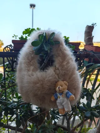 Borsa in morbido materiale beige, perfetta per aggiungere un tocco di stile. - Orsetto portachiavi incluso. - Dettagli in blu.