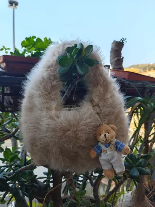 Grazioso folletto natalizio, perfetto per aggiungere un tocco magico alle tue decorazioni. - Cappello a cono rosa scintillante con pompon. - Vestito in maglia rosa con dettagli in pelliccia. - Sciarpa e guanti coordinati. - Gambe lunghe con calzini e scarpette bianche. - Decorato con pigne e palline natalizie su un cerchio di legno.