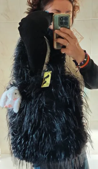 Borsa in pelliccia sintetica nera, molto morbida e voluminosa, con un simpatico ciondolo a forma di coniglietto bianco. - Materiale: pelliccia sintetica - Dettaglio: ciondolo coniglietto bianco