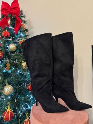 Eleganti stivali neri con gambale largo e tacco alto. - Materiale scamosciato. - Punta affusolata. - Design slanciato.