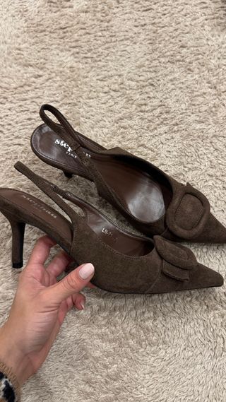 Eleganti décolleté in camoscio marrone. - Materiale scamosciato. - Dettaglio fibbia decorativa sulla punta. - Modello slingback con cinturino. - Tacco a spillo.