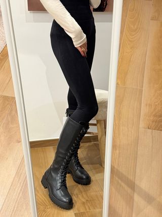 Anfibio alto in pelle nera con lacci. - Design stringato. - Suola carrarmato. - Zip laterale per facilitare la calzata.