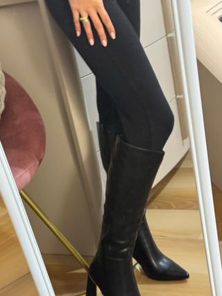 Eleganti stivali alti neri con un dettaglio dorato sul tacco. - Punta affilata. - Tacco squadrato con inserto metallico dorato. - Zip laterale per facilitare la calzata.