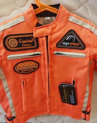 Giubbotto da moto per bambino, taglia 6 anni. Colore arancione vivace con dettagli a contrasto. - Patch Limited Edition sul petto sinistro. - Patch High SPEED sul petto destro. - Patch Speed Race Motorcycles sul petto sinistro. - Tasche frontali con zip. - Etichetta Polymax con informazioni sul materiale.