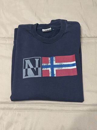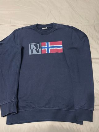 Felpa Napapijri con un design distintivo. - Logo N stilizzato su sfondo a scacchi. - Stampa della bandiera norvegese. - Colore blu scuro.