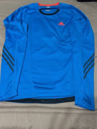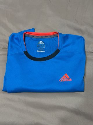 Maglia tecnica Adidas di colore blu, ideale per l'allenamento. - Logo Adidas arancione sul petto. - Dettagli neri sul collo. - Fodera interna arancione sul collo.