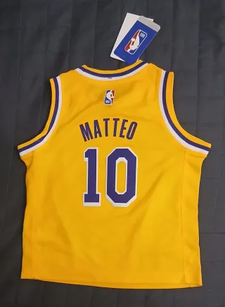Vendo bellissima maglia dei Lakers, originale Nike, col numero 10, acquistata sul sito specifico NBA store, taglia americana 4T, nuova con cartellino, mai usata, personalizzata col nome Matteo. È adatta ad un bambino di nome Matteo, di 4-5 anni, che abbia altezza tra i 98-108 cm. Purtroppo è stata regalata a mio figlio che ha 7 anni ed è troppo piccola. Prezzo d'acquisto 60 Euro. Le misure della maglia sono petto: 36 cm, altezza 42 cm.