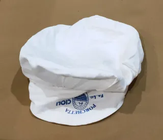 Copricapo professionale, utilizzato nel settore della ristorazione, caratterizzato dal logo della storica azienda Fa.Lu. Cioli, produttrice della celebre Porchetta di Ariccia. - Design classico e funzionale. - Logo PORCHETTA FA.LU. CIOLI.