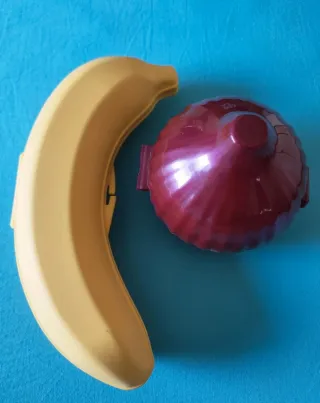Contenitore porta banana, protegge da urti e schiacciamenti. Contenitore salvacipolla, per conservare metà cipolla in frigorifero mantenendone l'odore isolato. Utili per la cucina e per trasportare. - Forma di cipolla. - Forma di banana. - Plastica resistente. - Design simpatico e colorato.