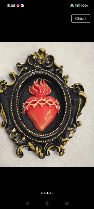 Bellissimo ex voto a forma di Cuore Sacro, realizzato artigianalmente. - Cornice in resina finemente decorata. - Dettagli dorati sulla cornice. - Cuore rosso con fiamme e corona di spine.