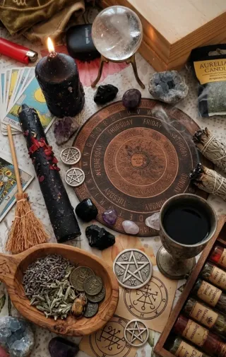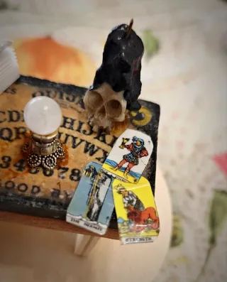 Miniatura di un tavolino a tema stregoneria, perfetto per collezionisti o per creare diorami. - Tavolino con decorazioni Ouija e numeri. - Include un teschio con candela nera. - Presenti tarocchi e una sfera di cristallo. - Dettaglio di una mano scheletrica. Fatto a mano
