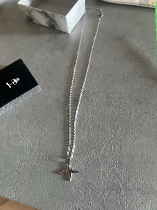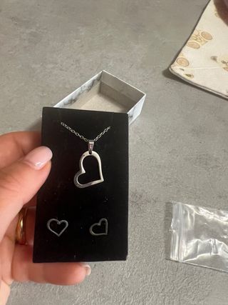 Bellissimo set coordinato composto da collana con ciondolo a cuore e orecchini a lobo abbinati, in acciaio. Il design è moderno, minimal ed elegante, perfetto per l'uso quotidiano o come idea regalo. • Dettagli collana: Ciondolo a cuore traforato, lunghezza totale circa 45-50 cm (vedi foto con metro per la misura precisa). • Dettagli orecchini: Piccoli cuori coordinati con chiusura a farfallina e protezione in gomma inclusa. • Condizioni: Ottime, mai indossato. • Extra: Include la scatolina originale con trama effetto marmo, ideale per un regalo.